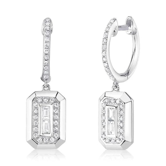 14K White Gold Diamond Huggies With Diamond Baguette Drop Earrings