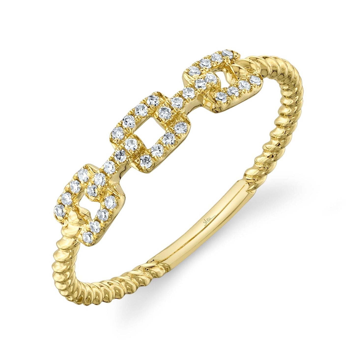 Indulge in the modern geometric design of this 14K Yellow Gold Diamond Link Ring. Each link is adorned with round diamonds, creating a path of sparkle that's perfect for day to night wear.