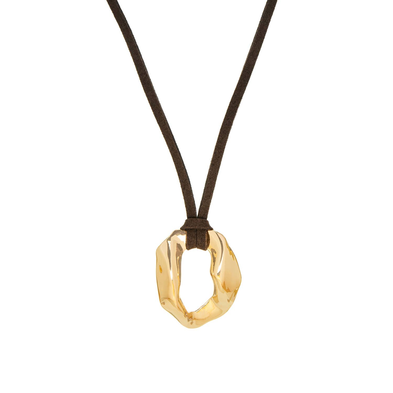 Bold yet effortless, this necklace pairs a soft brown suede cord with a gleaming sculptural O-shaped pendant. The pendant’s organic, molten-like form creates a striking focal point, while the 16-inch suede cord with 2-inch extender adds comfort and versatility. Designed as a statement piece, it balances earthy texture with modern shine for an easy day-to-night accessory.